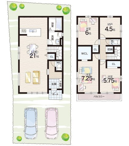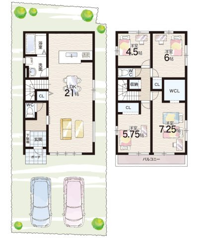 LDK 21.0帖/洋室 7.2帖/洋室 6.0帖/洋室 5.7帖/S 4.5帖 - 向き
