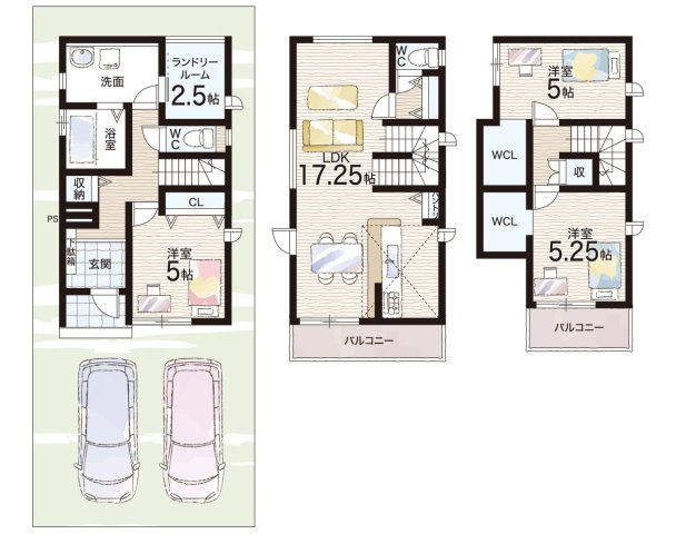 洋室 5.0帖/S 2.5帖/LDK 17.2帖/洋室 5.2帖/洋室 5.0帖 - 向き
