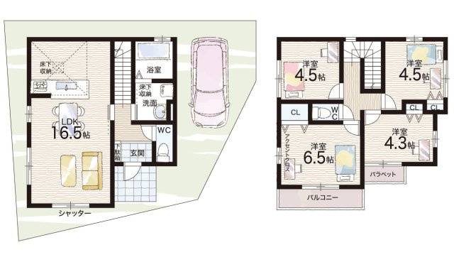 LDK 16.5帖/洋室 6.5帖/洋室 4.5帖/洋室 4.5帖/洋室 4.3帖 - 向き
