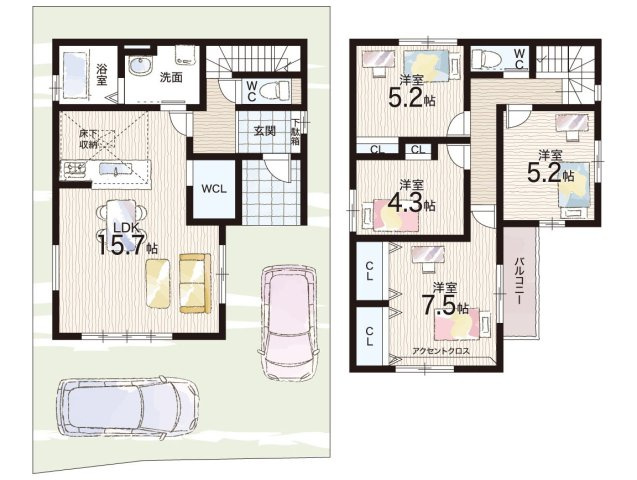 LDK 15.7帖/洋室 7.5帖/洋室 5.2帖/洋室 5.2帖/洋室 4.3帖 - 向き