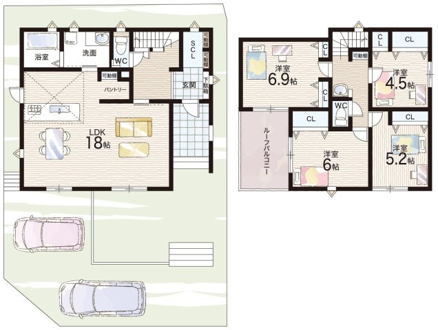 LDK 18.0帖/洋室 6.9帖/洋室 6.0帖/洋室 5.2帖/洋室 4.5帖 - 向き