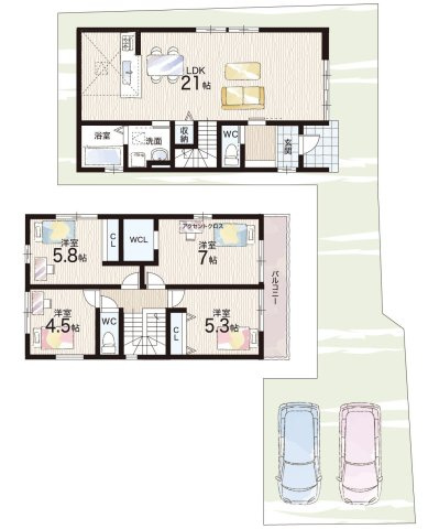 LDK 21.0帖/洋室 7.0帖/洋室 5.8帖/洋室 5.3帖/洋室 4.5帖 - 向き