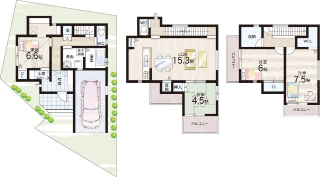 洋室 6.6帖/LDK 15.3帖/和室 4.5帖/洋室 7.5帖/洋室 6.0帖