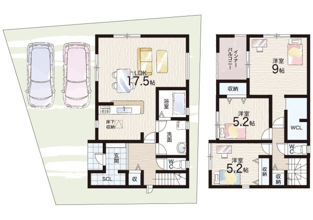 LDK 17.5帖/洋室 9.0帖/洋室 5.2帖/洋室 5.2帖 - 向き
