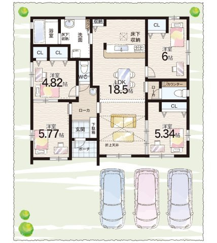 LDK 18.5帖/洋室 6.0帖/洋室 5.7帖/洋室 5.3帖/洋室 4.8帖 - 向き