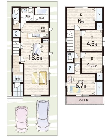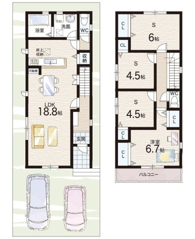 LDK 18.8帖/洋室 6.7帖/S 6.0帖/S 4.5帖/S 4.5帖 - 向き