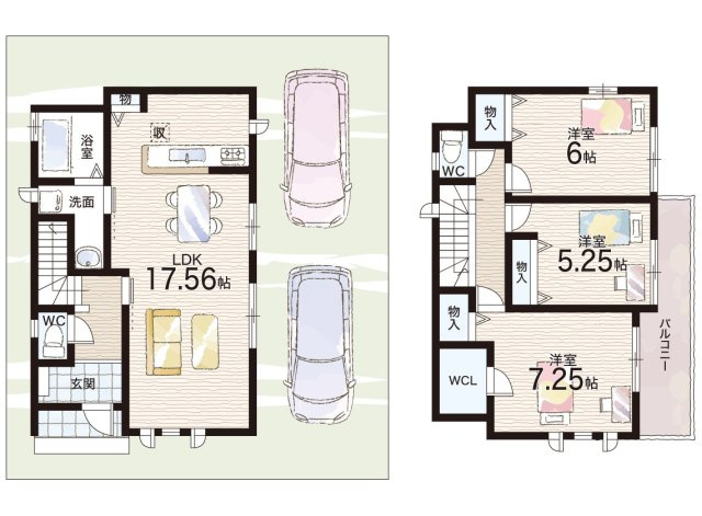 LDK 17.5帖/洋室 7.2帖/洋室 6.0帖/洋室 5.2帖 - 向き